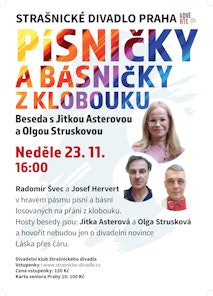 Hravé pásmo s písněmi na přání losovanými z klobouku s besedou divadelní novinky Láska přes čáru. Hosty této besedy budou herečka Jitka Asterová a režisérka Olga Strusková.