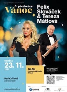 Tentokrát se můžete ponořit do krásných melodií, operních árií a dalších hitů v podání vynikající sopranistky Terezy Mátlové a legendy Felixe Slováčka. Koncert se uskuteční v neděli 23.11.2025 od 16:00 v Evangelickém kostele v Orlové. Neváhejte prožít nezapomenutelný hudební večer v rámci koncertu „V předvečer Vánoc“, který Vás příjemně naladí na nadcházející období Adventu a Vánoc. Svou účastí zároveň podpoříte kulturní památku - Evangelický kostel v Orlové.